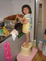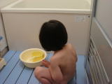 「いっちはおとさんとお風呂に入ると、お風呂場でおしっこをするから、お風呂でさせてみたら?」とパパの言葉を思い出し、今夜はお風呂前、洗面器をおまるにしてトライしてみましたが、出ませんでした。しかし、ママがお風呂場をちょっと離れていたら、「出た〜!」と依亜の声。よく見ると、お風呂場のスノコにおしっこをしてあったのです!「あ〜、おかさん、見られなかった・・・残念」と言うと、「おかさんが見てない時、又するからね」と依亜。 |