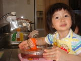 帰宅して、依亜は一休みでねんね。お夕飯は“ピーマンの肉詰め”を依亜と作りました。依亜はピーマンに肉を上手に詰めてくれました。そして、一口、お肉だけトライしましたが、玉葱を炒めないで肉と混ぜたせいか、「シャリシャリする」とイヤな顔。今度はちゃんと玉葱を炒めます。パパは帰宅して、依亜の作ったピーマンの肉詰めを「おいしい・おいしい」と食べていました。