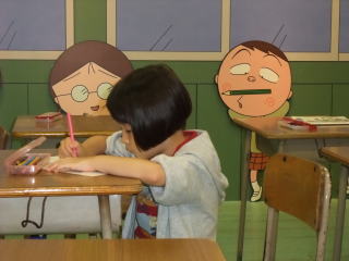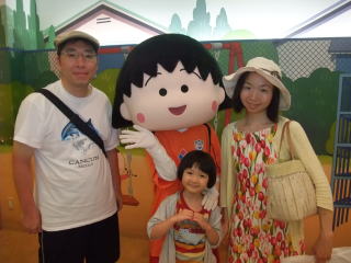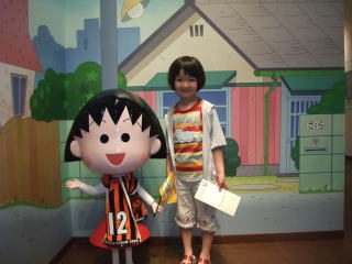 | そして、毎度おなじみのサプライズ。 ここは、ちびまる子ちゃんランド じゃあ、依亜と一緒に入ってみよう!! @入り口でまるちゃんが迎えてくれるよ。 今日は清水エスパルスの試合の日だから、ユニフォームを着ているんだって。  | Aまるちゃんのお家には、家族が勢ぞろいして賑やかだね。 あれ?電話が鳴っているよ〜  |
