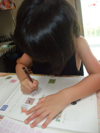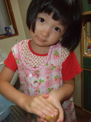 | まずは、ひらがなドリルでお勉強  | お次は、夕飯のお手伝い お稲荷さんをキュッキュッキュッ  |