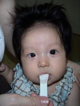 |  依亜は哺乳瓶を受け付けないので、そろそろマグにトライしようと、午前中、みかん果汁をマグに入れてみました。ストローをかじったり、なめたりしているうちに吸い上げたのですが、まずい顔。続いて白湯でトライするもうまく吸えず。