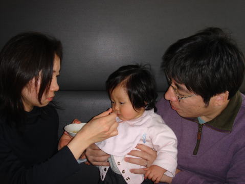 |  |  何でもよく食べる依亜ですが、最近は食べが悪くなりました。つかまり立ちをするようになって、食べるより動いていたいのかもしれません。依亜をチェアーからおろすと、パパ・ママのテーブルを支えに立ち上がり、パパ・ママの食事を邪魔します。でも、今夜はよく食べてくれました!メニューは今冬初の鍋・「キムチ鍋」。勿論、依亜はまだキムチ味はNGですが、鍋から依亜の食べられるものを少し取り分け、ほんのり味噌味に。初めて親子3人で鍋を楽しみました。パパが大きなお口を開けて食べるので、それにつられて依亜も大きなお口を開けて食べているのです。