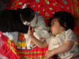 |  |  雨が強く降っている朝。昨日、依亜やパパの心配をしていたママが“フワ〜、フラ〜”としていました(少し具合が悪いのかしら)。 お昼前、依亜がおねむに入ったので、ママも横になって休むことにしました。・・・ フッと気づくともう14時半、依亜と一緒に目覚めました。ゆっくり休んだおかげでママは元気復活です。明日の帰宅に備え、パパが夜、来てくれました。依亜はお風呂あがりでしたが、6日ぶりに会う依亜を見て、「お人形さんみたい。背が伸びた。大人になった」と。