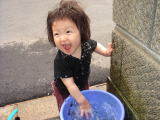 |  外は曇り空。しかし、バケツにはった水を見た依亜、遊ばずにはいられません。最初こそ、“パシャ パシャ”とおとなしく遊んでいたのですが、だんだんとエスカレート。バケツの水とホースも持って”バシャーン バシャーン”と大はしゃぎ。水遊びってそんなに楽しいの?と思うほど、生き生きした表情の依亜。案の定、びしょ濡れとなってしまったので、風邪を引かないようにシャワーをして着替え。疲れてすぐに眠ることを期待しましたが、依亜はまだまだ元気、大きな声を上げながら歩いています。しかし、お昼を食べていたら、だんだん機嫌が悪くなり、イスからおろしてお布団へゴローン、すぐに寝つきました。