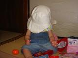 |  午前中は近所の公園へ。「公園へ行くよ〜!」とママが玄関で準備していたら、依亜はママの横を通り過ぎ、別の部屋へ行ってしまうので、「あれ?」と思ったら、依亜はママの帽子をかぶってトコトコ戻ってきたのでビックリ。  依亜には大きすぎる帽子で、前が見えないのによく歩いてきたなぁ。