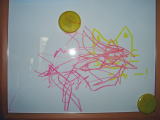 今日は依亜が絵を描きました。依亜には手の届かないところにあるホワイトボード、お姉ちゃんが抱っこして、マーカーを依亜に握らせると、赤いマーカーで何やら描きました・・・完成♪