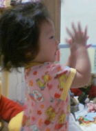 今夜はパパ、会社の飲み会があったので、依亜とママは二人でお夕飯とお風呂を済ませました。お風呂あがりテレビをつけると、NHKの歌番組でタッチー(細川たかし)が“浪花節だよ人生は♪”を派手☆派手に歌っていました。それを見た依亜はテレビに釘付けで、体を揺らし手拍子でノリノリ。ママは写真を撮るのも忘れ(かろうじて、携帯電話の写真で1枚撮った)、その姿をじっと見つめてしまいました。依亜は、演歌も好きなのかしら?