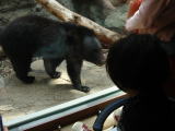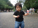 さて、いよいよ動物園へ!上野動物園といったら、やはり“パンダ”。しかし・・・パンダ“リンリン”は眠っていて動かず、隣の部屋にいたレッサーパンダもおねむ。残念でした。次は“象”。本で見る象さんよりもうんと大きくてビックリしたことでしょう。ちょうどお昼だったのか、ムシャムシャと食べている象さんたちを見て、依亜は「かっぱっぱ」と言いながら、“かっぱえびせん”を食べ出しました。次は“猿”、こちらもお食事中で、トマトを食べていました。可愛い小さな小猿もいて、依亜も興味深そうに見ていました。 象さん、お猿さんがお昼だったので、依亜もお昼としました。ちょっと変わったお猿さんを目の前に、やきそばをツルツル。そのうち、依亜はそのお猿さんに近づき、まるでお話をしているようでした。