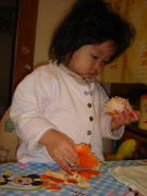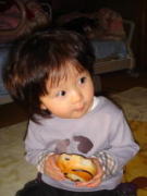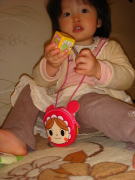 |  |  ママはまた失敗です。今朝は依亜の大好きな“うなずきんちゃん”(←恭子お姉ちゃんからのプレゼントで、声に反応してうなずくお人形)をコーヒーの中に落としてしまいました。出勤前のパパに分解して見てもらったけれど、濡れてしまった“うなずきんちゃん”は動いてくれませんでした。「うなずきんちゃんを弁償しなくては!」とママはおもちゃ屋さんへ行こうと思いましたが、今夜は恭子お姉ちゃんが泊まりに来てくれるので、ずうずうしいとは思ったのですが、お姉ちゃんに買ってきてと頼みました(勿論、ママがお支払いしましたよ)。