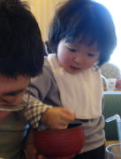 |  依亜は“いくら”が好き。一昨日の帰宅時、ママ実家から“いくら”をもらってきました。そして、今夜のお夕飯に登場!しかし、“いくら”は依亜にとっては少々塩分が多いので、小皿に適量とし「パパと仲良く食べてね」とママは言いました。依亜はいくらの小皿を自分に引き寄せパクパクと、他のものは全く口にせずでした。パパが依亜に「いくらちょうだい!」と小皿を取ると、イスから立ち上がり、パパのところま小皿を取り返しに行きます。こうして、今宵は依亜とパパの“いくら争奪戦”が繰り返され、依亜が勝利したのでした。 |  |  |