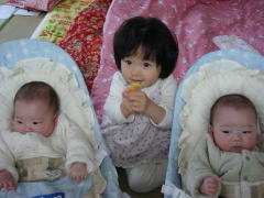 |  |  今日はパパとママのお友達夫妻宅へ、昨年10月に誕生した女児twins(ナオちゃん、ソラちゃん)へ会いに行きました。依亜は電車の中で寝てしまい、パパとママがお昼を食べている間もずっと寝ていましたが(依亜は寝る前にお昼を済ませていた)、twinsちゃんのお宅に到着すると目覚めました。人見知りの依亜、男の人・twinsちゃんのパパにも慣れないだろうなぁ・・・と心配していたのですが、twinsちゃんパパにはすぐに打ち解け、ナオちゃん、ソラちゃんのおもちゃをお借りして、twinsちゃんパパと一緒に遊んでいました。