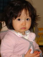 |  お家には写真がたくさん飾ってあります。その中にママと恭子お姉ちゃんの幼い頃の写真が1枚あります。今日はパパがその写真を依亜に見せ「コレは誰?」と聞くと、じっとその写真を見て黙り込んでいましたが、「わっかんない!」と手を振りながら答えました。パパが「こっちがねえちゃん、こっちがママ」と教えると、依亜はすぐに理解し「ねえちゃん、ママ」と写真を指さしていました。 |  |  |