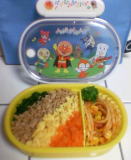 |  |  パパはお弁当を持って出勤しますが、今朝はママ、依亜にもパパと同じお弁当を作ってみました。依亜のお弁当箱は先日ママババが買ってくれた“アンパンマン”のお弁当箱。メニューはママお得意(?)の“4色ご飯”と“ナポリタン”です。