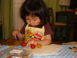 昨日、パパが買ってくれたアンパンマンのエプロンつけて、ママのお手伝い。包丁でプチトマトをさらに小さく切るのよ。丸くて小さくて、難しいわ・・・