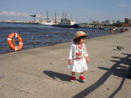 |  |  横浜開港祭というお祭りに行って来ました! 開港祭にふさわしい良い天気。ママは朝からバタバタして支度に手間取る中、依亜は玄関で靴を選んでいたのですが、家を出る時に依亜が「suica持った?」するとパパが「あっ!忘れた!!」と。。。意外に一番冷静なのは依亜なのです
