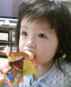 |  |  近くのスーパーマーケットの子供広場で遊んでいましたが、お友達が2人来たところで、「うまい棒食べる」と言って子供広場を出た依亜はベンチに向かって走り出しました。しかし、転んでしまい、ベンチに頭を“ゴーン”とぶつけてしまい大泣き。ママは依亜を抱き上げて帰宅。帰宅して手を洗いながらも泣いていたのですが、手を洗い終わると泣きながら「うまい棒!」と。そして、うまい棒を一口食べたら泣き止んだのでした。