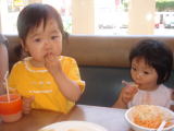 お昼はファミリーレストランでお友達の”カホちゃん”とカホママ”シーちゃん”と待ち合わせ(残念ながら、”カホパパ”は来られませんでした)。依亜と恭子お姉ちゃんがカホちゃんと会うのは2ヶ月ぶりですが、パパとママはずいぶん久しぶり。カホちゃんもまもなく2歳となるので、大きくなったなぁと思いました。最初こそ、カホちゃんは人見知りをして依亜とも距離をおいていましたが、すぐに慣れて一緒にお食事。そして、パパにも抱っこされました。最近はカホちゃん、食べなくなってしまったとシーちゃんが言っていた通り、カホちゃんは飲み物と氷、ポテトフライを口にしていて・・・「皆、同じなんだなぁ」と思ったママでした。