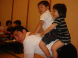 |  |  お姉ちゃんからメールが届きました。依亜は朝起きると、「おかさんは?・・・おかさんを見に行く!」と泣き出したようです。そして、お風呂へ行こうと誘ってもイヤがったそうですが、お風呂に連れていってしまったらゴキゲンに。今朝も3人で温泉に入り、朝食バイキングを3人でたくさん食べたそうです。パパとママがホテルへ3人を迎えに行き、チェックアウトをして、パパジジ1回忌のため、お寺へ行きました。1回忌を終え、お昼は近くのレストランで。コウ君と依亜は皆さんの前で歌を御披露したり、パパをお馬さんにして歩かせたり、とにかく場を盛り上げていました。