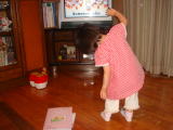 夕方、依亜はテレビを見ていたのですが、前へ前へと行ってしまうので、ママは「バック、バック」と注意しました。それでも依亜は言うことをきかないので、テレビを消してしまいました。そして、ブロッコリー代の返金にスーパーへ行こうと依亜に声をかけたのですが、「行かない!」と怒っています。仕方がないので、依亜をおいてママひとりでスーパーへ。勿論、テレビは消して行きました。帰宅すると、依亜は玄関のところに座っていました。