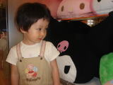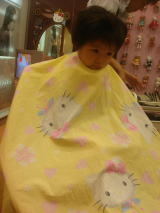 デパートにあるキティちゃんの美容室。依亜は前から気になっていたのですが、ここで髪を切ることには首を縦にふらなかったのですが、少し前から気が変わったのでしょうか、「キティちゃんのところで切りたい」と言い出すようになったのです。今日、やっとキティちゃんの美容室に足を踏み入れたのですが、いざ中に入ると固まってしまい、口を開かないのです。イスに座り、キティちゃんのガウンをかけてもらっても、どこか一点をじっと見つめていて、美容師のお兄さんに「どのDVDを見たいかな?」と聞かれ、「これ」と”ウサハナ”というキャラクターのDVDを指差し、DVDが始まると、じっとその画面を上目遣いで見ているだけ、何を言っても答えないのです。