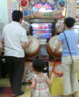 4人で買い物へ行き、パパとお姉ちゃんはゲームセンターで太鼓を叩いて遊んでいました。依亜は2人の間で、音楽に合わせて踊っていました。