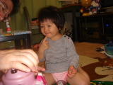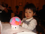 食後はお土産の“苺のロールケーキ”が登場。誰の誕生日でもなかったのですが、依亜が好きだからとロウソクを2本つけてもらいました。依亜は“ハッピーバースディ♪”のお歌を4回歌い(ディアの後、依亜ちゃん、おかさん、おとさん、お姉ちゃんと、入れ替えたので)、4回ロウソクを吹き消し、やっとケーキを食べることができたのでした。