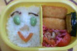 |  |  気分はすぐれなかったけれど、朝のうちはまだ少し元気があったのか、不器用なママがお弁当に初めて“装飾”をしました。ご飯の上に、枝豆と切り干し大根と昆布を使って、顔を描いてみました。