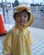 |  |  今日も雨。しかし、「いっちは雨大好き♪」と。そんなわけで、依亜に合羽と長靴を履かせ、スーパーマーケットへ。