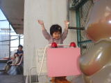 |  |  晴れ!朝からお洗濯にお布団干しとママがバタバタしている間、パパと依亜は車を車検へ出しに行ったり、クリーニング屋さんへ行ったりと近所に外出。二人が帰宅し、お昼前、ハロウィンの仮装祭りへ出かけました。お祭りはとても混んでいて、幼い子は派手に仮装している人を見て泣いている子も・・・ 依亜は仮装している人を見て泣くことはありませんでしたが、そのお祭りに全く興味を示さなかったので、早々に切り上げて近くのデパートの屋上へ移動。前回は夏の暑い日に遊びに訪れたため誰もいなかったけれど、今日は秋晴れで心地よいせいか、屋上にはチビッコがけっこういました。依亜は「ここ、来たことあるっしょ!!」とエレベーターを飛び出し、乗り物へダッシュ!パパは依亜の後を追ったのですが、ママは再びエレベーターで地下の食料品売場へ。ママ、お腹ペコペコで気持ちが悪くなり、食べ物を買いに行ったのでした。おにぎりを2つ買い屋上へ戻ると、依亜は楽しそうに遊んでいました。おにぎりも食べ、「もっと遊ぶ〜!」とたくさん遊びごきげん♪