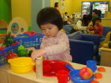 カフェで休憩した後、 ワールドポーターズへ行き、ここでやっと、依亜が遊べそうなお店を見つけまし た。依亜が遊んでいる間、ママはお手洗い。休日の横浜はどこも混んでいて、 お手洗いも行列。お手洗いを済ませお店に戻ると、依亜はパパに抱っこされて寝 ていました。寝たばかりの依亜をすぐに起こしては可哀想だからと、パパはベ ビーカーに依亜を乗せず、抱っこしたまま寝かせていたので、フードコートでイ スを見つけ、そこに座って落ち着きました。