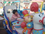 のミッキーに会って写真を撮り、依亜はとても喜んでくれました。  次は“空飛ぶダンボ”、こちらも40分待ち。しかし、依亜の希望ですので、ひたすら並んで待ちました。依亜はお姉ちゃんと一緒に乗って、こちらも満足してくれました。ダンボの後は、近くにあった“メリーゴーランド”。こちらは待ち時間がなかったので、依亜は2度乗りました。