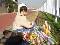 |  |  マンションの上のお宅で改修工事が始まり、工事の音が大きく響いて、お家に居たくなくなりました。しかし、毎日どこかへ出掛けるわけにもいかないので、今日はお昼、レジャーシートとお弁当を持って、近くの川沿いで食べることにしました。シートを広げると、依亜は靴を脱いで座り、「楽しい〜」と言いながら、お弁当をパクパクとよく食べました。その後、公園へ行くと言うリクエストに応えました。