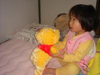 “プーさんのぬいぐるみ”を抱きしめ、「プーさんと一緒に寝る」、