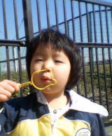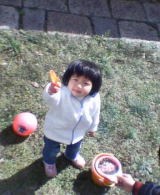 |  |  買い物から戻り、『お砂場遊びの道具、シャボン玉、おにぎり1個、ヨーグルト1個』を持って公園へ。今日の公園には依亜と同じ2歳児が4人いて、皆、お砂場で遊んでいました。早速、依亜も仲間に入れてもらったのですが、お砂遊びもそこそこに「シャボン玉やる〜」と言いだし、一人でシャボン玉を始めてしまいました。 すると、4人のお友達がシャボン玉に飛びついてきて、皆シャボン玉に夢中・・・ そうなると、依亜はお砂遊びに戻ってしまうのでした。