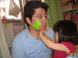←顔にペタペタとシールを貼られ放題のおとさんです