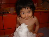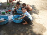 |  |  保育園の園庭開放へ行ってきました。園児はプールに入っていましたが、園庭開放に来ているチビッコは入れません。しかし、たらいをいくつか用意してあり、それに水を張って遊べたり(“どろんこ遊び”となります)、保育士さんがホースで水を撒いてくれ、チビッコは水浴びです。依亜は昨日、図書館で借りた『どろんこ』という本と同様、どろんこ遊びを楽しみ、水浴びも喜んでいました。園庭開放終了15分前、シャワーを使わせてもらえ、キレイに体を流して、お着替えをしました。