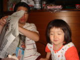 |  |  ママ起床の5分後、依亜も起床。熱が下がり、安心しました。午後、ママは皮膚科、依亜は耳鼻科へ。帰り道、100円ショップで依亜はパパへと“薬ケース”を買いました。そして、帰宅すると、「プレゼントだから!」と、自分の持っている袋で、薬ケースをラッピング。21:45、部屋を暗くして横になったのですが、依亜は眠らず・・・22:05、パパの帰宅で起き上がり、プレゼントを渡しました。パパはとても喜んでいました。そして、依亜、パパとまたお夕飯を食べて、はしゃいで・・・23時半近く、やっと眠りました。