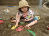 |  |   依亜は相変わらず一人で遊んでいましたが、裸足で砂だらけを楽しめたようです。しかし!依亜が一度だけ、「私も入れて!」と声をかけました。その相手は、インド人の美人母子!!ママさんは若くてとても美人だし、チビッコは依亜と同じ3歳女児で、名前はPちゃん。とってもキュート。私・ママも仲間に入り、4人でお砂遊びをしながら、少しお話もしました(御主人様のお仕事で日本に来て2年。しかし、あと1年でインドに帰国。よって、Pちゃんはインドの園に通うそうです。ママは「インドに帰りたくない、日本にいたい!」と言ってました)。