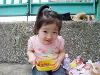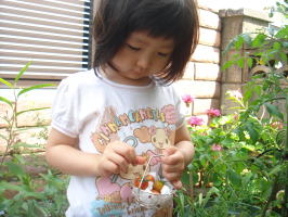 初めての園庭開放、保育園に着いて門を開けていただくと、依亜は保育士さんに「グッモーニン!」とおはようのご挨拶。名札を付けて、早速、お砂遊びです。園庭開放には20人位の入園前のチビッコがいました。チビッコ達は園の遊び道具等をお借りして自由に遊び、ママ同士はおしゃべりをしたり・・・ママは園児と一緒に遊ぶのかと思っていたので、公園と同じような感覚に戸惑いもしました。