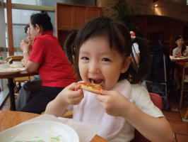 耳鼻科を出るとお昼になっていたので、近くのレストランで食べてから帰宅しました。 帰宅して、お昼寝をした後、15時半から図書館で行われている“おはなしの会”に行ってみました。“おはなしの会”とは、図書館で月に2回開催されていて、お座りをして話を聞ける子を対象に、絵本を読んでくれるものです。(ママはこのような会があるのを昨日知りました。) 依亜は“おはなしの会”会場の図書館会議室に一番で到着。しかし、開始2分前になっても誰も現れない・・・図書館のお姉さんが、「一人でもやりますよ!」と言ってくれましたが、集まったのは依亜を入れて4人(男児3人+依亜でした)。絵本3冊を読んでもらい、最後はなぞなぞの本を1冊。なぞなぞは依亜もはりきって答えていました。