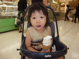 お昼、暑いのに依亜はお弁当を屋上で食べると。ママは覚悟を決めて屋上へ。日陰のベンチに座るも“暑い!” 急いで食べて(依亜は遊びながら食べるので、大汗をかいていました)、デパート内に戻りました。ベビーカーを借りて依亜を座らせ、眠ってくれるのを待ちました・・・そして、ママはお買い物で、旅行バッグを購入。買い物後、依亜を起こし、ソフトクリームを食べて帰宅しました。