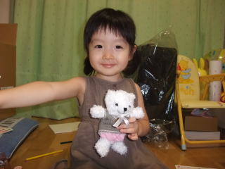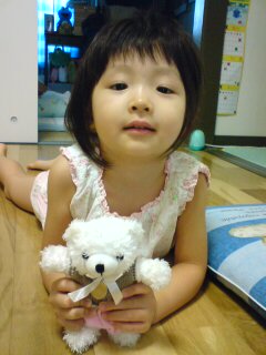 今日から“我が家の子”となった白クマちゃんは“シロちゃん”と名付け、依亜はとても可愛がっています。勿論、夜はシロちゃんを抱っこして寝ました。