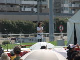 パパもママも競馬の趣味はありませんが、本日の競馬場は“ファン感謝デー”ということで、いくつかイベントがありました。その一つ、『渡る世間は鬼ばかり』というドラマでお馴染み、カヅちゃん役の女優さん・宇野なおみさんが来ていて、“カヅちゃんと遊ぼう”というイベントに参加してみました。野外ですので、とても暑かったし、3人ともカヅちゃんには全く興味がなかったので、楽しかったとはいえませんでした。