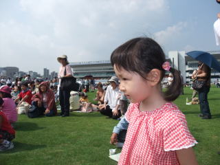 パパが依亜とママを連れて来た場所、それは『競馬場』でした。駅から競馬場まで、レースがある日は無料バスがあったのですが、本日は昼のレースがなく、夜のレースの為、行きはバスが走っていませんでした。よって、歩くことになりました。競馬場までの道のり、長距離でしたが、依亜は一生懸命歩きました。 途中、コンビニで買い食いをしたりすると、「遠足みたい!」と喜んだかと思ったら、今度は「うんち!!」と言いだし、たまたま近くにあったホテルに入ってトイレを済ませ、ようやく到着したのでした。