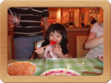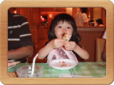 |  |  パパの夏休みはまだあります。今日は依亜、“映画館デビュー”をしました。パパが起きるなり、「映画、“ポニョ”観に行く?」と依亜に言い、空いている初回にしようと、大急ぎで準備をして家を出ました。上映時間の15分位前に映画館に到着し、ポップコーンとウーロン茶を買って席に着きました。予想通り、館内はガラガラで、依亜は補助椅子を2つ積み上げて、『崖の上のポニョ』を見ました。