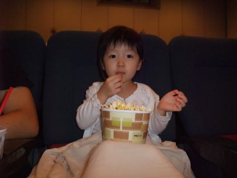 映画の予告+ポニョ101分と長時間だったので、依亜は飽きてしまわないかと心配していたのですが、ポップコーンをムシャムシャと食べながら、熱心にスクリーンを観て、ポニョを楽しんでいました。そして、最後にポニョの歌が流れると、一緒に振り付けをしながら歌っていました。