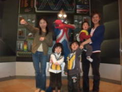 ショウ君も依亜も一生懸命打っていました。すると、悪者は倒れたのですが、またすぐに起きあがり、スタッフのお兄さんを捕まえました。そこに、ウルトラマン参上!!ウルトラマンと悪者が戦いを始めると、チビッコたちは「頑張れ〜」とウルトラマンを応援します。依亜もつられて大きな声でウルトラマンを応援していました。チビッコたちの応援あって、ウルトラマンは悪者を倒しました。そして、チビッコたちと記念撮影。楽しいひとときでありました。