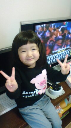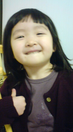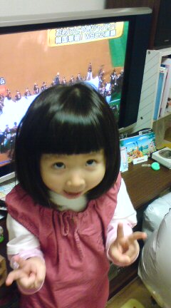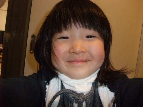 |  |  楽しみのヘアカットへ。今回もショートカットにする親の願いは叶わず、後ろ髪は跳ねない程度にカット、そして、前髪は・・・パッツン!短くしてもらい、見事な“おかっぱ”が誕生しました♪