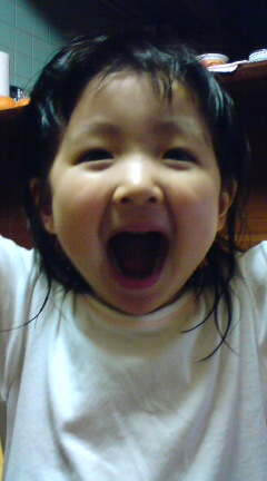 帰宅したパパ、すぐに服を脱ぎお風呂場へ。依亜に“サプラ〜イズ”でしたが、依亜はニヤリと笑っただけ。しかし、パパの早い帰宅、パパとのお風呂は大好きな依亜ですから、喜んだことは言うまでもありません。