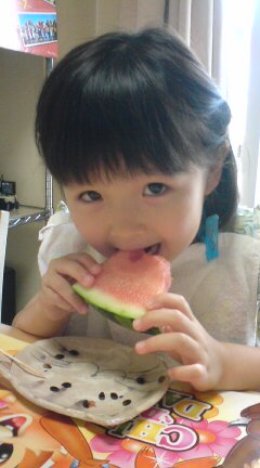 今日は依亜、幼稚園でスイカ割りをして楽しかったようです。スイカも食べたようで美味しかったと。スイカ、お家では食べない依亜ですが、みんなで食べると、やっぱり美味しいよね。お給食もその調子で食べてくれるといいのだけど・・・